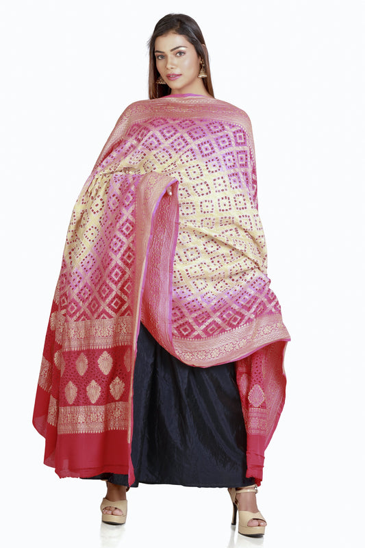 Banarasi Bandhani Dupatta Online In Pink And Cream Colours - Pure Khaddi Chiffon Silk!