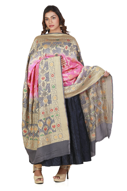 Banarasi Bandhani Dupatta With Minakari Work In Grey Pink Colours - Pure Khaddi Chiffon SIlk