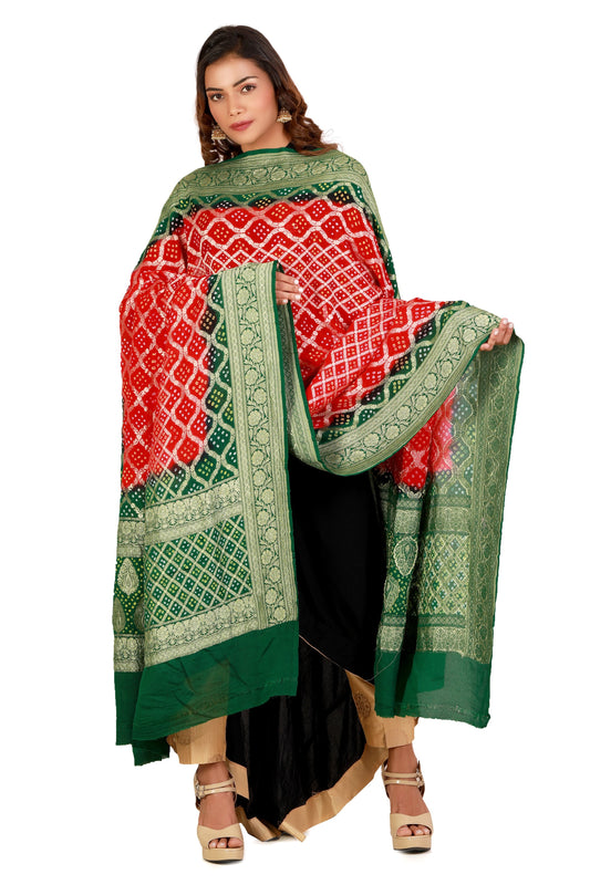 Bandhej Banarasi Dupatta In Red, Green Colours - Pure Khaddi Chiffon SIlk