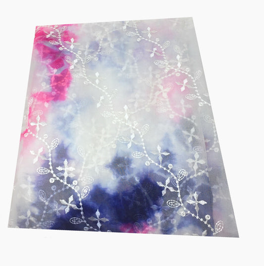 Organza Fabric Material in White Base Pink, Purple, Ink Blue, Embroidery Work