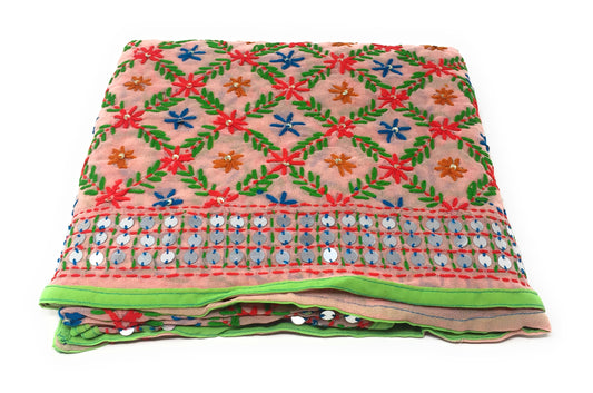 Pink Green Phulkari Dupatta, Multi Colour Embroidery, Mirror Work