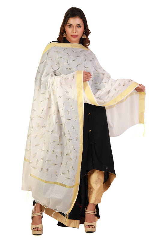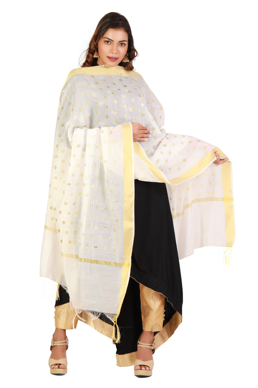 White Dupatta With Golden Border With Printed Gold Foil Work