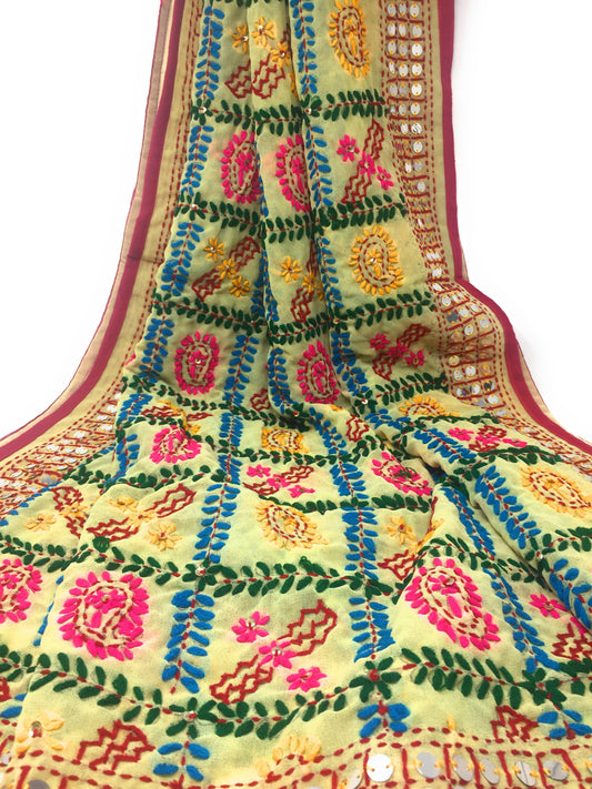 White Phulkari Dupatta, Multi Colour Embroidery, Mirror Work