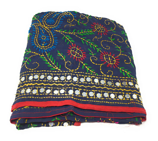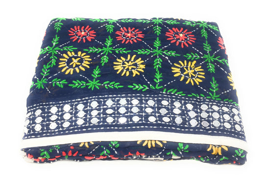 Navy Blue Phulkari Dupatta, Multi Colour Embroidery, Mirror Work