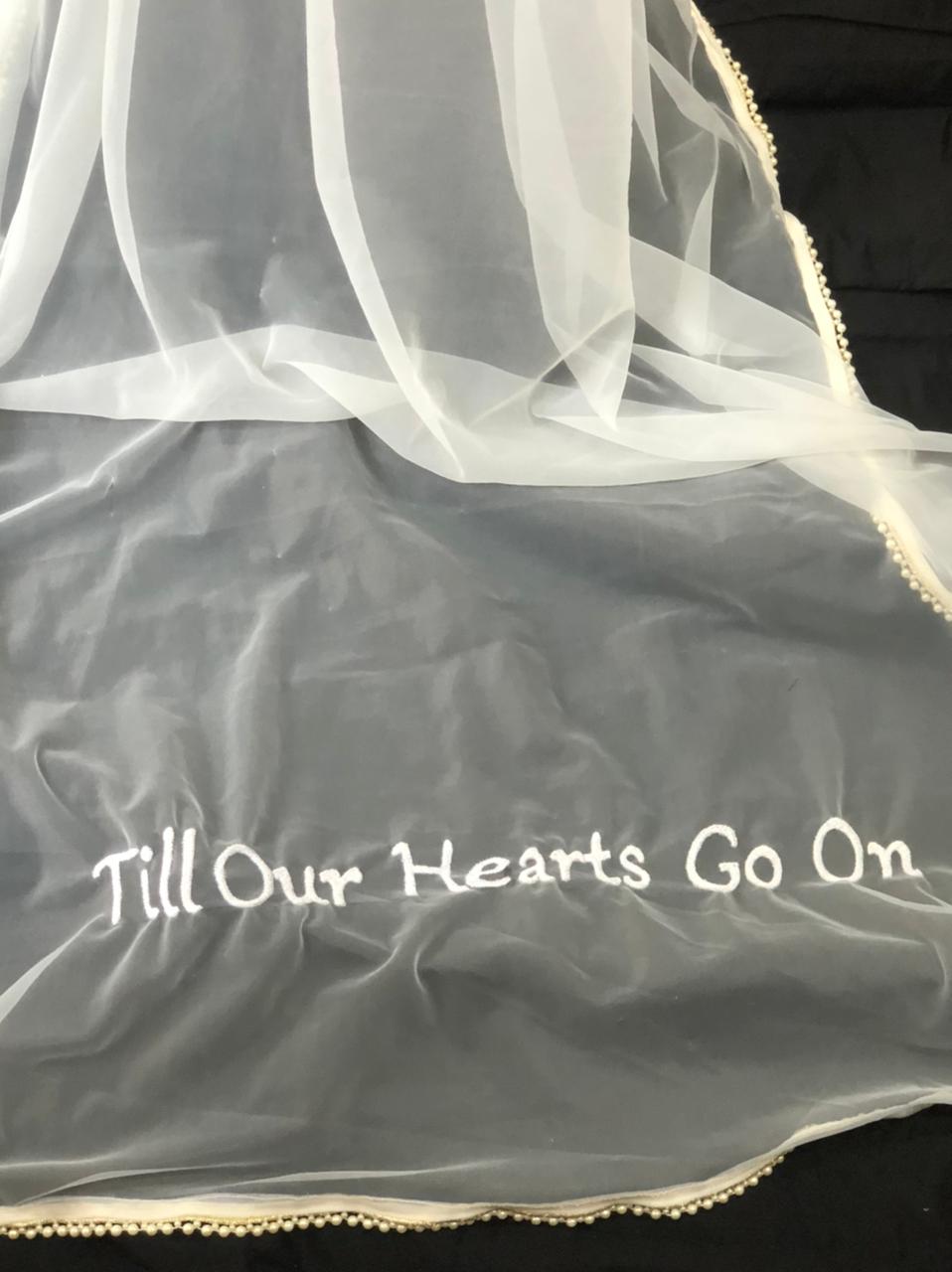 We made this beautiful veil for Sandra and added her favourite message - "Till Our Hearts Go On!"