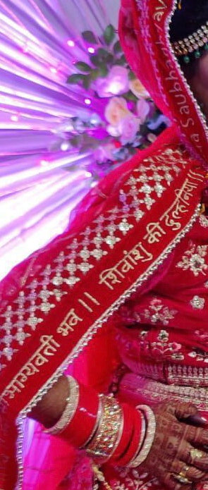 Customized Embroidered Sada Saubhagyavati Bhava Heavy Wedding Dupatta, with the name of bride & groom or any message of your choice and On Demand. Any Name, Any Colour, Any Message, Any Language.